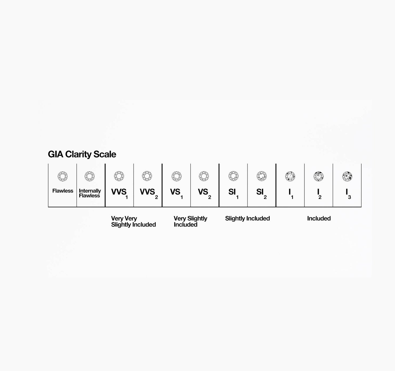 Den internationellt erkända klarhetsskalan från Gemological Institute of America (GIA) graderar diamanter från Flawless (FL) till Included (I) baserat på mängd, storlek och placering av inneslutningar och ytfläckar.