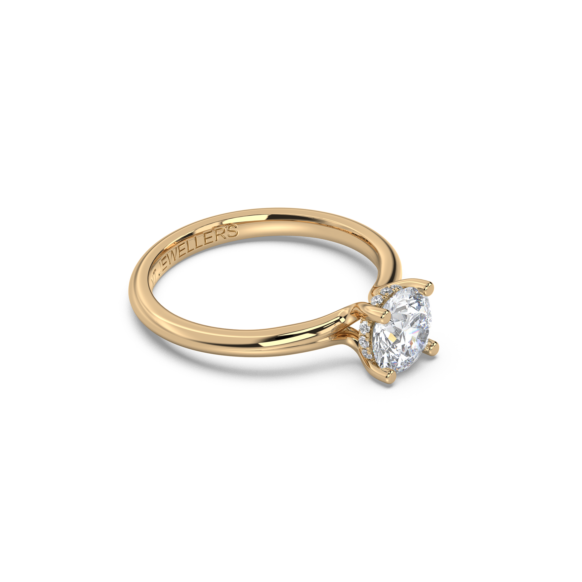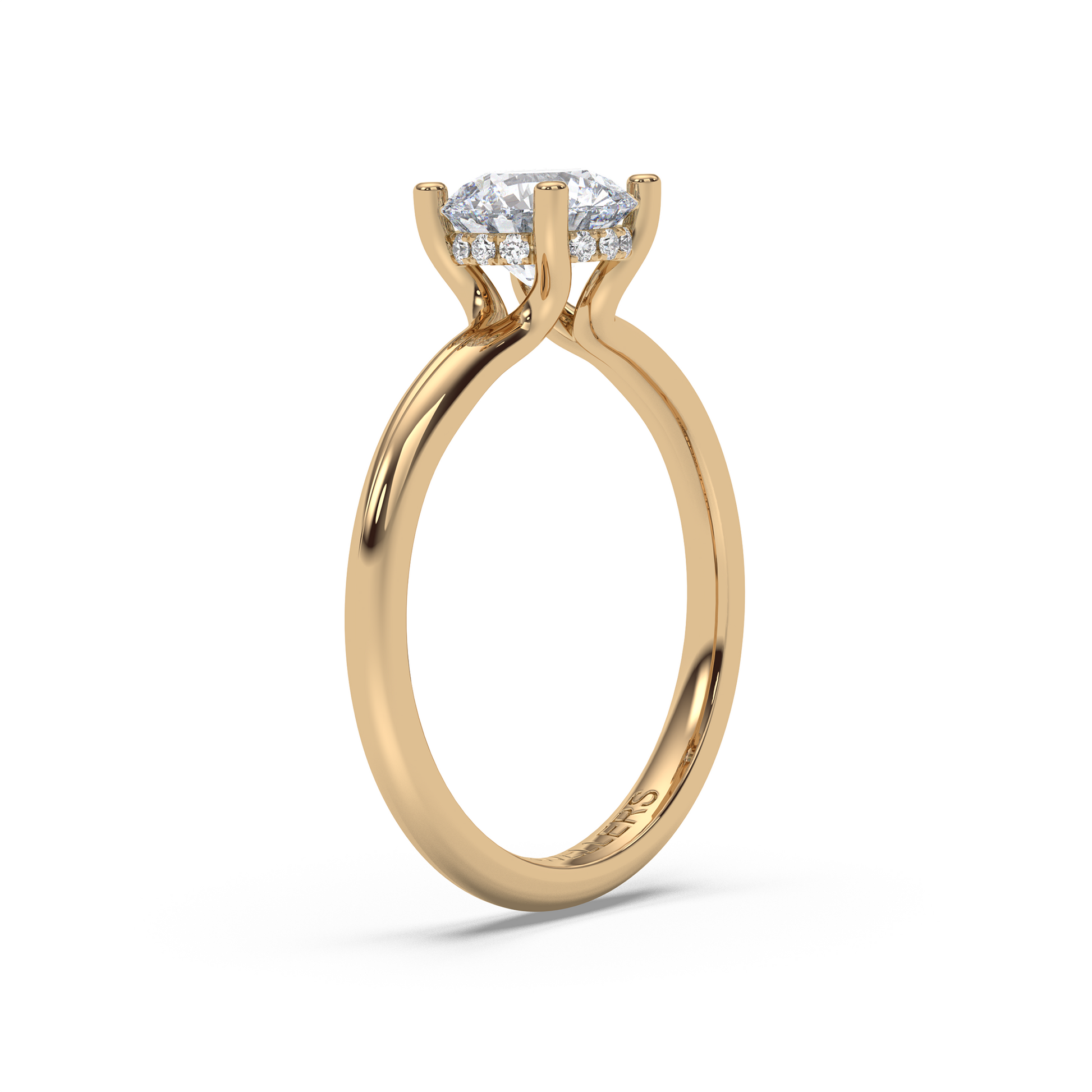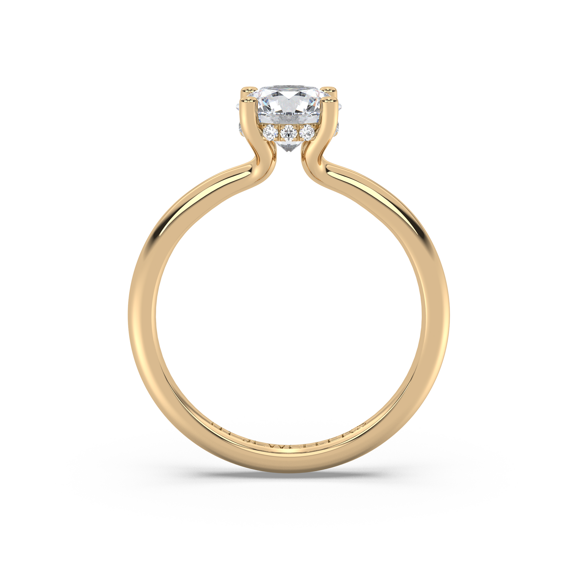 Aura är en samtida tolkning av solitärens klassiska skönhet. Den delade skenan öppnar sig mjukt mot mittstenen och hålls samman av en diskret hidden halo – en cirkel av ljus som framhäver diamantens inre glöd. Resultatet är en luftig och harmonisk silhuett där stenen tycks sväva ovanför fingret.
