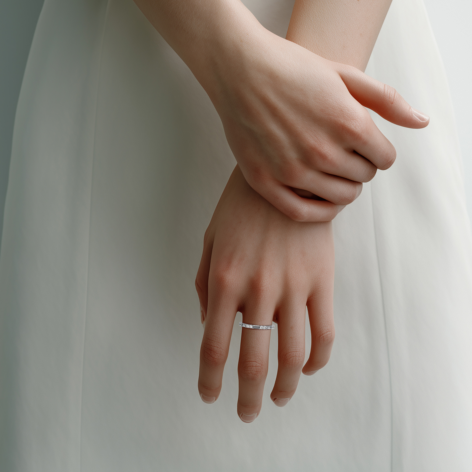 Enchanted är en elegant och modern alliansring som kombinerar två olika slipningar i en harmonisk design. Ringen är infattad med varannan baguetteslipad diamant och två briljantslipade diamanter, vilket skapar ett vackert och levande ljusspel. Den geometriska strukturen hos baguetter möter briljansens runda mjukhet – ett uttryck för balans och skönhet.